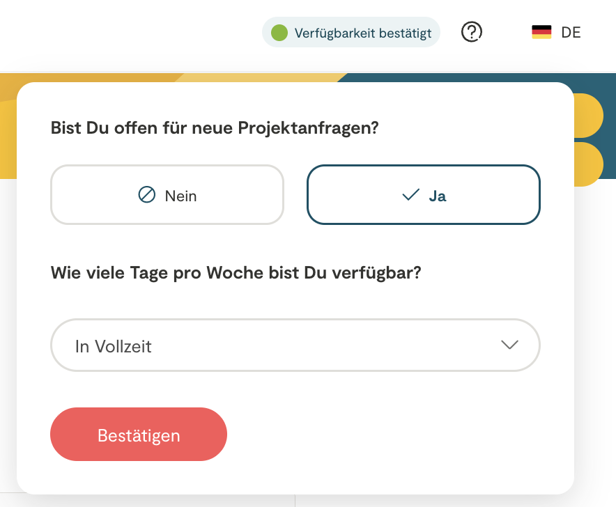 Sobald die Mission abgeschlossen ist, musst Du nur noch Deine Verfügbarkeit in Deinem Profil bestätigen und angeben, dass Du verfügbar bist (sowie die Häufigkeit: Vollzeit oder nur einige Tage).