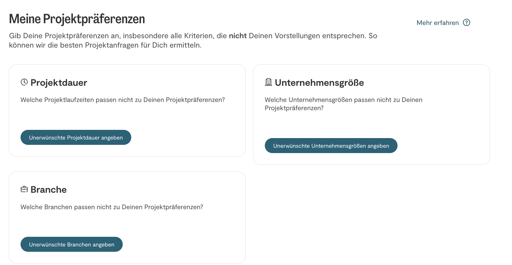 Dank eines speziell von unseren Datenwissenschaftlern entwickelten Matching-Algorithmus wirst du direkt benachrichtigt, wenn eine oder mehrere dieser Möglichkeiten mit deinem Profil und deinen Projektpräferenzen übereinstimmen, und du kannst sie in deinem Posteingang finden.