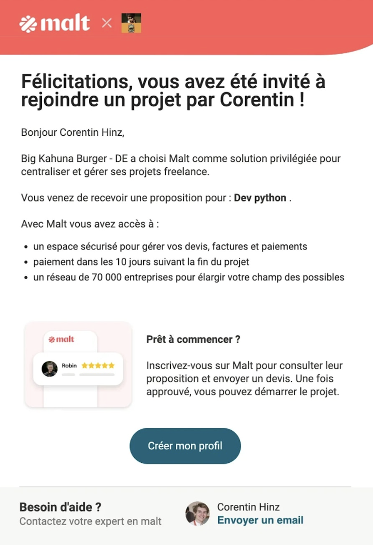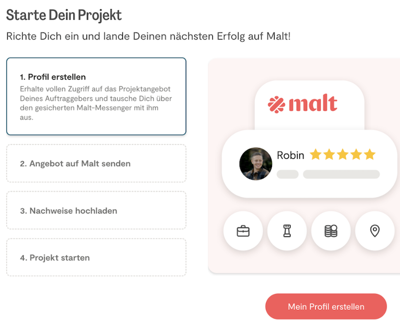 Wenn Ihr Kunde Sie eingeladen hat, Malt beizutreten, um an einem Projekt zusammenzuarbeiten, haben Sie jetzt Zugriff auf einen sicheren Bereich, in dem Sie Ihre Angebote, Rechnungen und Zahlungen verwalten können, wobei die Zahlung innerhalb von 10 Tagen nach Projektende erfolgt.