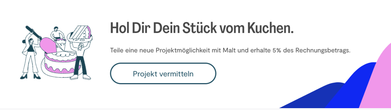 Das Empfehlungsprogramm bietet Freiberuflern und Beratern eine einfache Möglichkeit, ein passives Einkommen zu erzielen und Kunden glücklich zu machen, indem sie Projektmöglichkeiten auf Malt empfehlen. Wenn der Kunde mit einem Malt-Freelancer für das von ihm empfohlene Projekt zusammenarbeitet, erhält er 5% des Rechnungsbetrags des Projekts (TV).