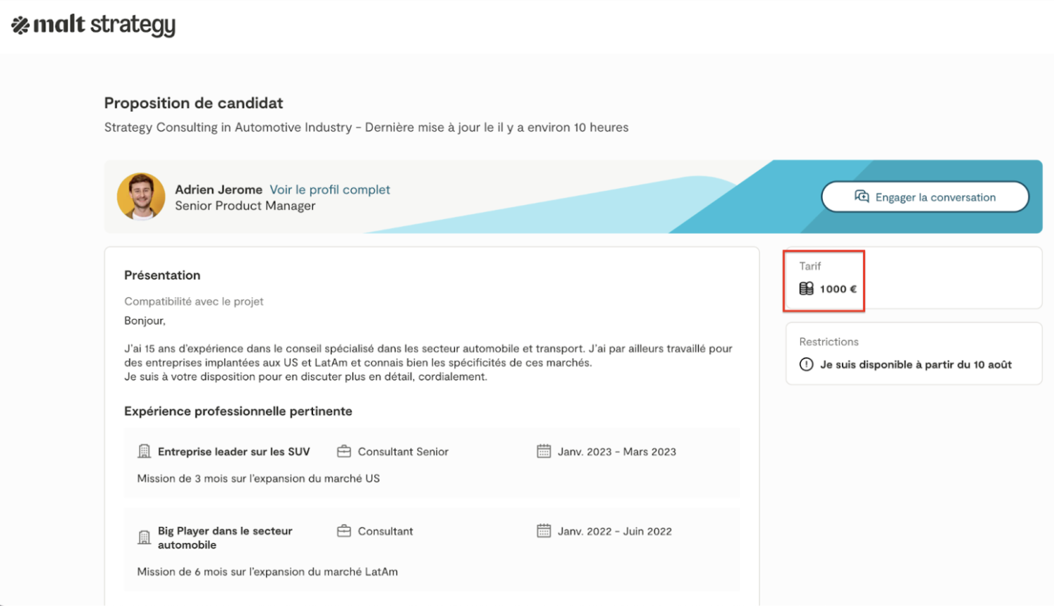 Bei der Bewerbung für ein Projekt werden die Berater*innen von Malt Strategy gebeten, ein Bewerbungsformular auszufüllen, das die folgenden Antworten enthält: eine einleitende Nachricht, etwaige Beschränkungen der Verfügbarkeit und des Standorts, relevante frühere Erfahrungen und den für das Projekt in Rechnung gestellten Tagessatz.