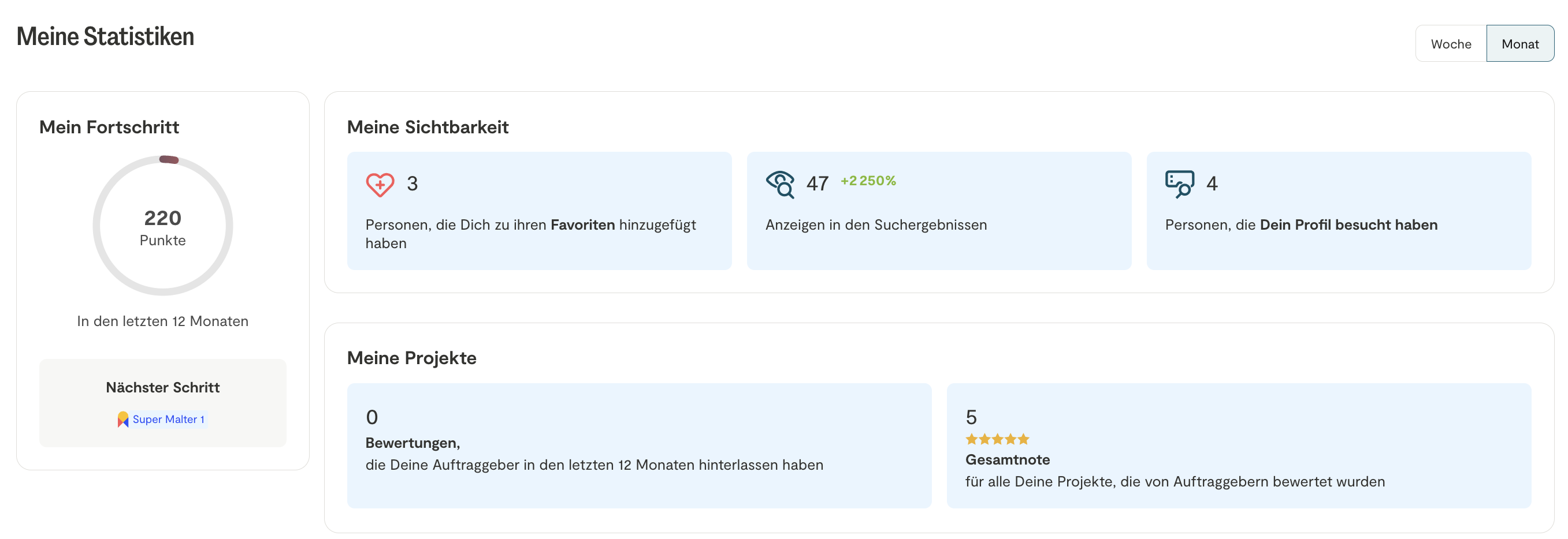 Die Anzahl der Besuche entspricht der Häufigkeit, mit der Dein Profil besucht wurde , d. h. wenn es ganzseitig im Webbrowser eines Kunden (oder eines anderen Freiberuflers) angezeigt wurde.