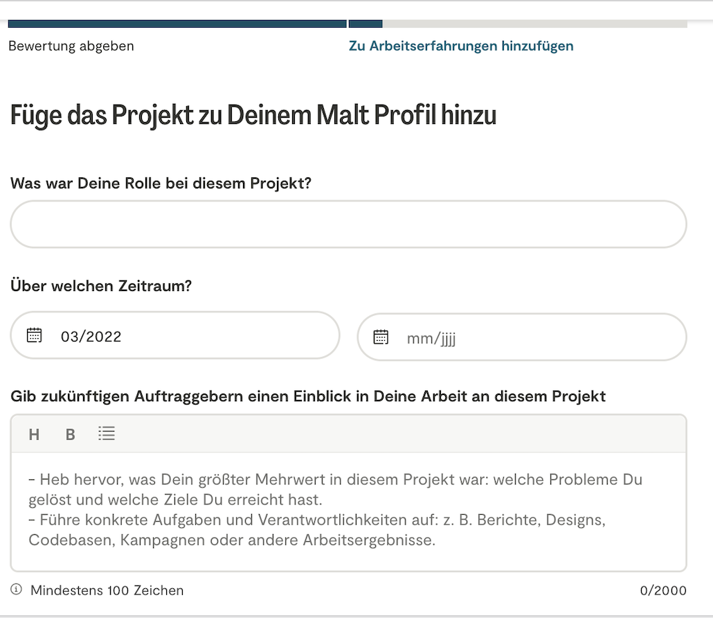 Bewertungen werden von den Kunden abgegeben, mit denen Du ein Projekt auf Malt abgeschlossen hast. Am Ende des Projekts können sie Dir zwischen 1 und 5 Sterne geben und einen Kommentar hinzufügen. Bei zeitbasierten Projekten ist eine Bewertung nur nach Abschluss möglich; dauert ein Projekt beispielsweise 6 Monate, erhältst Du die Bewertung erst nach Ablauf dieser Zeit. Wird ein Projekt storniert, gibt es keine Bewertung, da es nicht als abgeschlossen gilt.