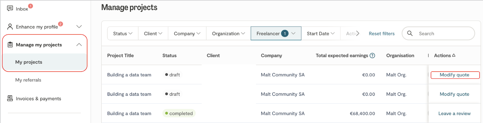 To do this, simply go to “Manage my projects,” then select “Proposals” to find any projects awaiting acceptance.