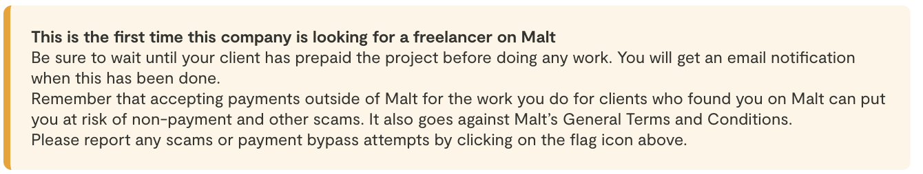 I think I'm facing a scam, what can I do? 24 September 2025 19:53 Updated It is important to us that you can work safely on Malt platform. This is why we moderate some client proposals before sending them to you. Related articles How does opportunities work for freelancers? My first step on Malt Conversations with your clients before starting a project The Super Malter program How billing and payment works in Malt