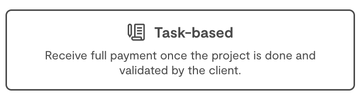 If you prefer to split your payment based on milestones or steps, we recommend breaking your project and budget into multiple task-based projects. This lets your client pay based on the deliverables you’ve agreed upon as the project progresses.