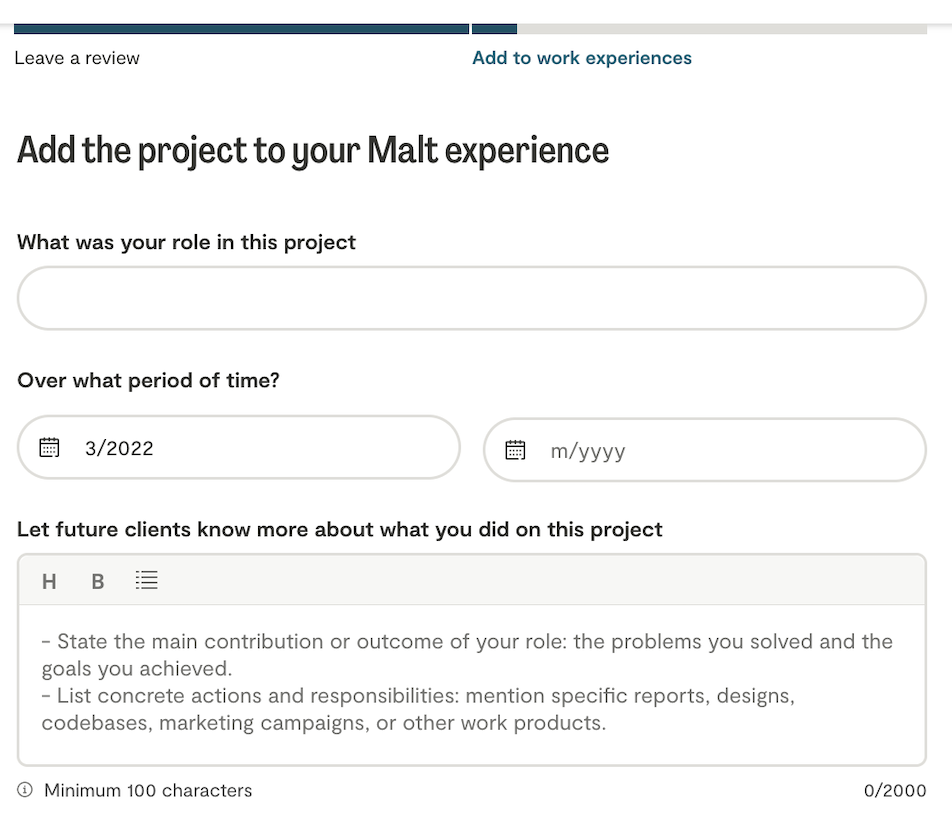 Reviews are left by clients with whom you’ve completed a project on Malt. At the end of the project, they can give you a rating from 1 to 5 stars and add a comment. For time-based projects, a review can only be given once the project is finished—for example, if a project lasts 6 months, you’ll only receive the review at the end of those 6 months. If a project is canceled, no review can be left since it is not considered completed.