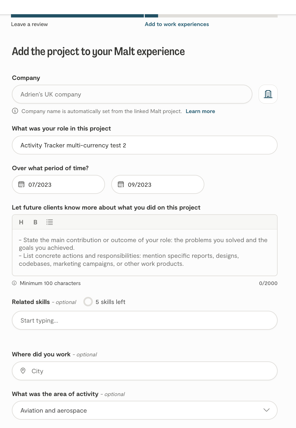In addition to reviews, you can also receive external recommendations on Malt from clients or colleagues you’ve worked with outside the platform. All you need to do is enter their email address, write a personalized message, and send the request. The person will then receive a link to your profile along with a short form to recommend you.