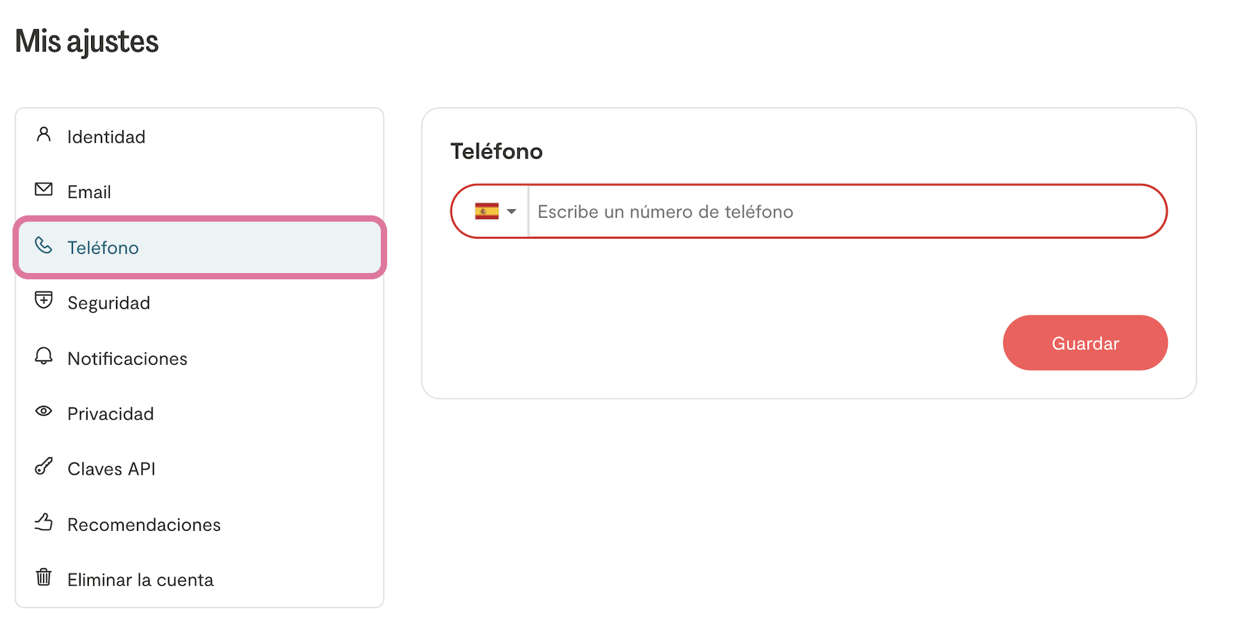 Modificar / Añadir mi número de teléfono Para modificar o añadir tu número de teléfono, dirígete a la sección «Ajustes» y haz clic en la pestaña «Teléfono». Asegúrate de indicar correctamente el código internacional correspondiente a tu país. Para guardar la información, deberás ingresar tu contraseña.