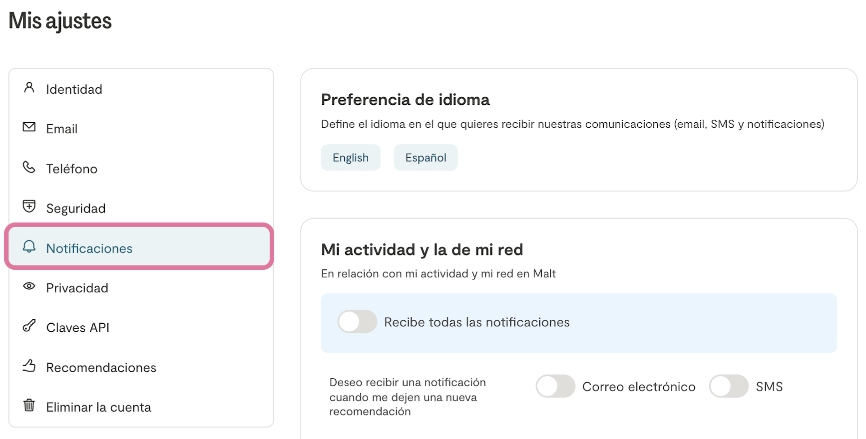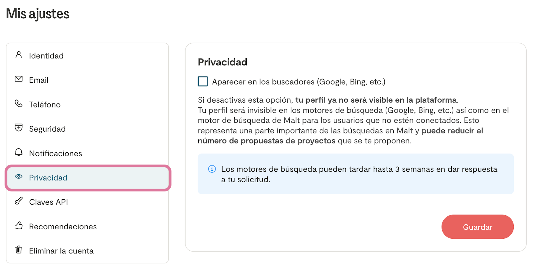 Cambiar mis nombres y/o apellidos Puedes personalizar cómo aparece tu identidad en Malt. Para ello, accede a los ajustes de tu cuenta a través del menú lateral de tu espacio Malt en la sección «Ajustes». Si usas un pseudónimo, aparecerá únicamente en tu perfil público. Sin embargo, tu nombre legal completo siempre figurará en tus facturas, conforme a la información que has proporcionado.