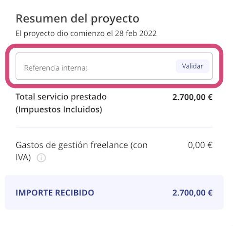 Es tan sencillo como acudir a tus proyectos, y en la página del proyecto añadela en "Añadir una referencia interna". A partir de este momento la referencia se mostrará en tu factura.