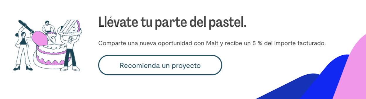 El Programa Embajador ofrece a autónomos y consultores una forma sencilla de obtener ingresos pasivos y hacer felices a los clientes recomendando oportunidades de proyectos en Malt. Si el cliente trabaja con un freelance de Malt para el proyecto que ha referido, ganará el 5% del valor facturado del proyecto (TV).