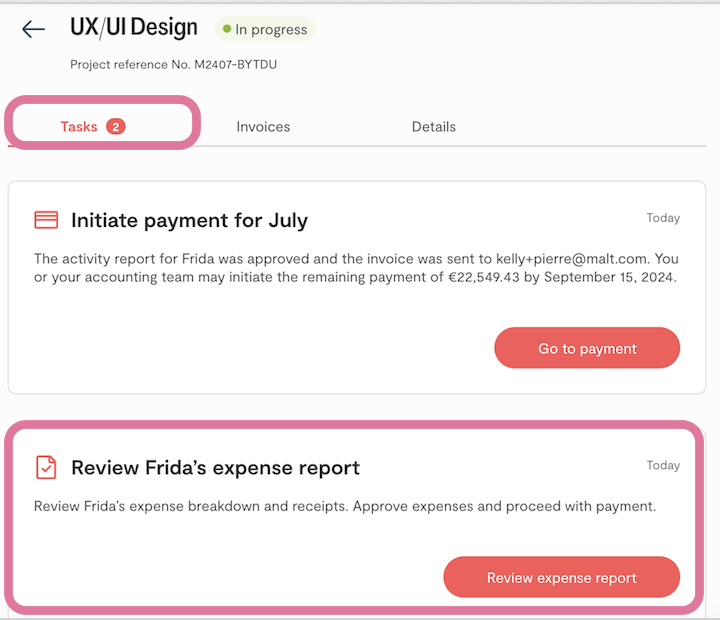 En la página de tu proyecto, aparecerá una tarjeta de tareas cada vez que haya gastos pendientes de tu aprobación. Al hacer clic en esta tarjeta de tareas, accederás directamente al informe de gastos correspondiente para revisarlo y tomar las medidas necesarias.