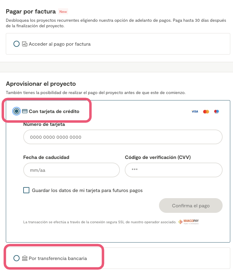 Cuando realizas el prepago, los fondos se depositan en una cuenta fiduciaria gestionada por Malt. El pago puede hacerse con tarjeta bancaria o por transferencia. Los fondos permanecen en la cartera del proyecto y te pertenecen hasta que confirmes el fin de la misión o el mes ha finalizado.