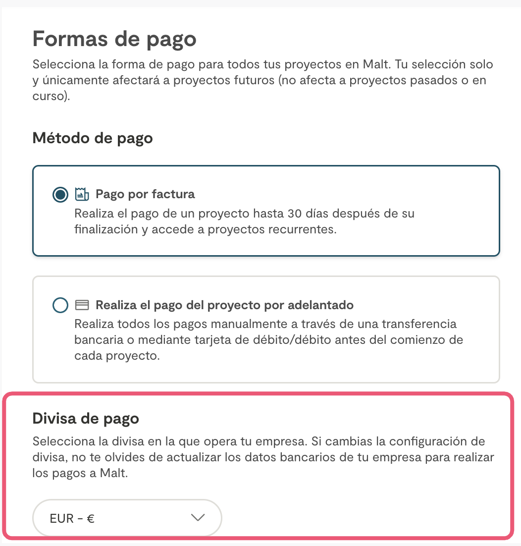 ¿Cómo pasar al pago por factura?De forma predeterminada, tu empresa está configurada para prepago. Puedes cambiar al pago de facturas al preparar un proyecto. Para ello, selecciona la opción “Pago por factura” y completa la información requerida. Para poder beneficiarse del método de pago de factura, debes haber completado un primer proyecto en Malt y tu empresa debe ser elegible para el anticipo en efectivo (avance de fondos).
