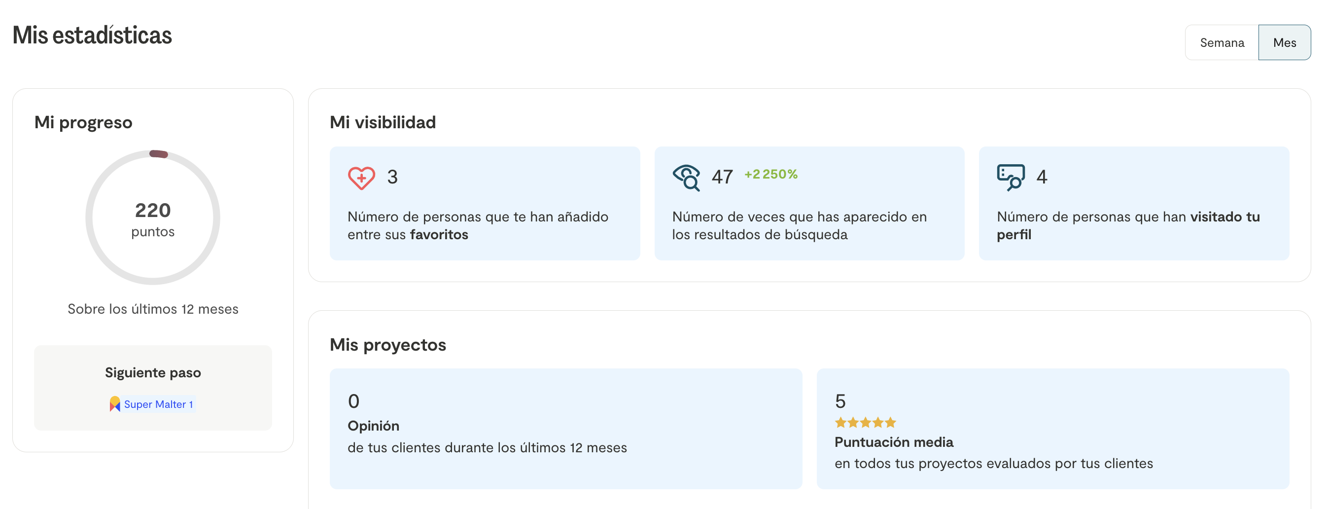 Una vez que un cliente confirma la finalización de un proyecto, los puntos correspondientes se añaden de inmediato y tu total actualizado aparecerá en tu panel. También puedes monitorear tu avance dentro del programa Super Malter.