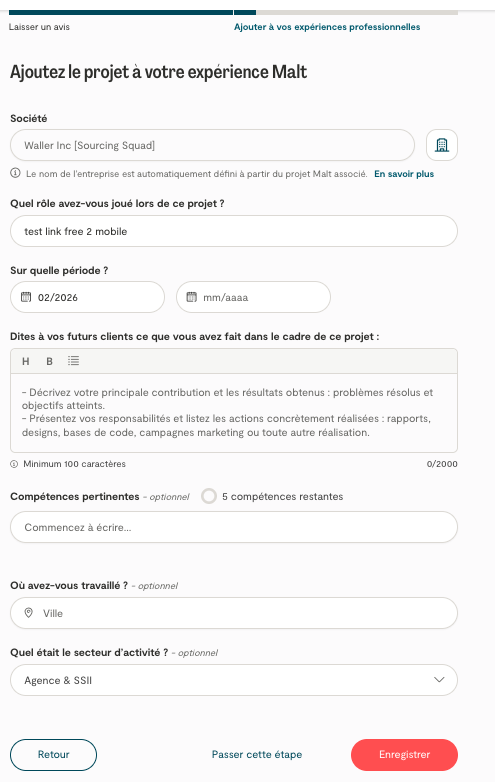Pour chaque demande, trois notifications sont envoyées (immédiatement, au jour 4 et au jour 15). Le lien est personnel et ne peut être utilisé que par la personne invitée. Pour laisser une recommandation, elle devra créer un compte Malt. Malt n’utilise pas les adresses email collectées à des fins commerciales.
