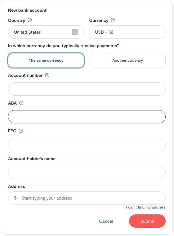 Afin de faciliter des paiements fluides et sécurisés en Dollars, nous vous demandons de suivre une étape supplémentaire lors de la configuration de votre compte bancaire.