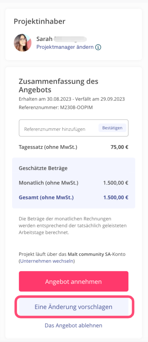 Um das Projekt im Einvernehmen mit dem Freelancer zu ändern, wende Dich bitte an das Support-Team: support@malt.com