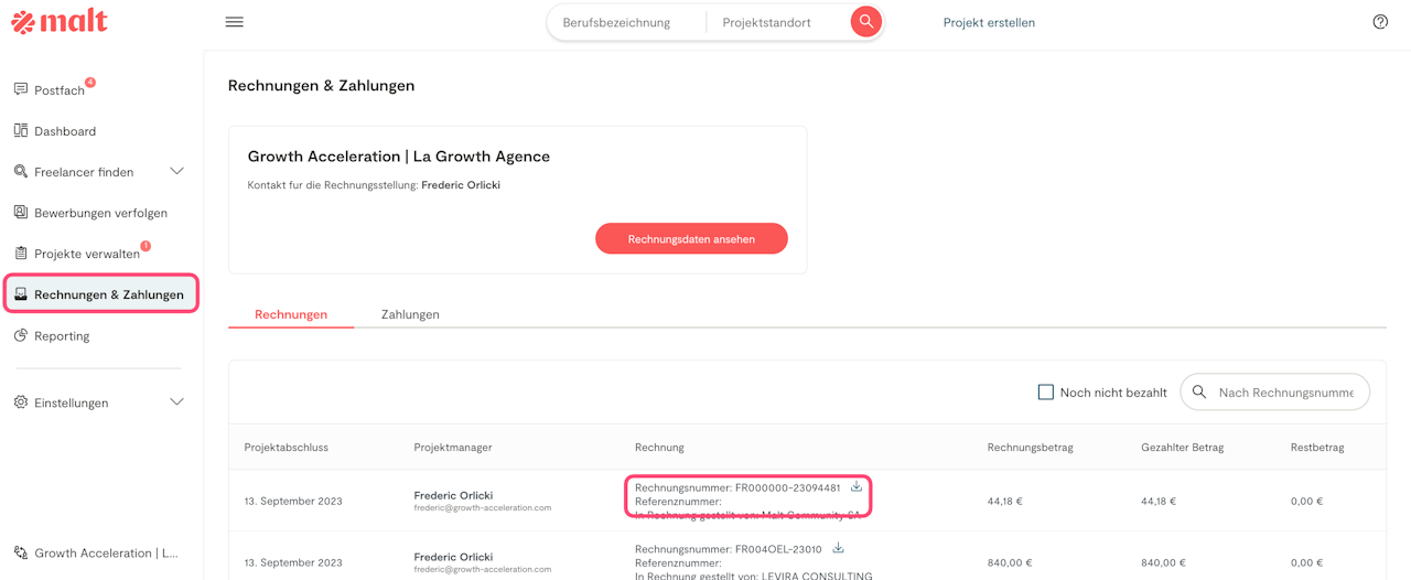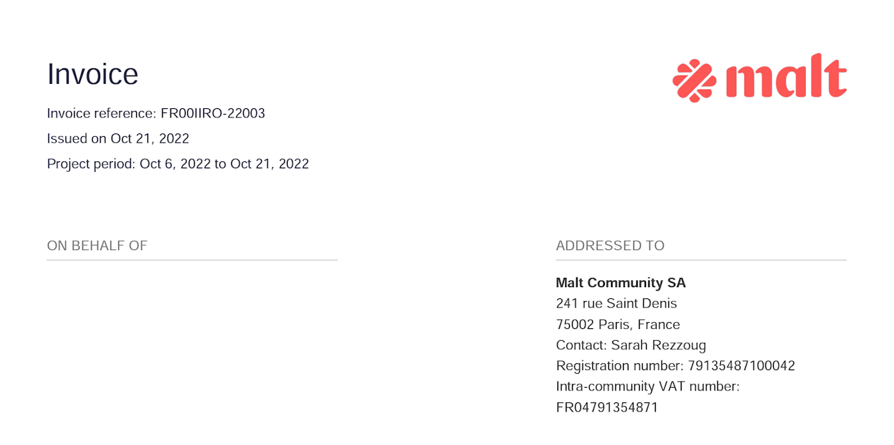 Dieses Modell ermöglicht die Ausstellung einer einzigen Rechnung mit Malt, in der der Projektbetrag und die Leistungsgebühren von Malt enthalten sind: