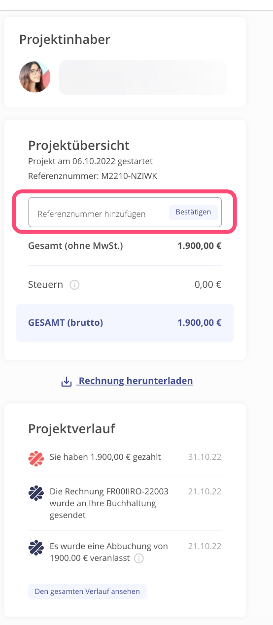Dies ermöglicht einen sehr einfachen Abgleich durch Deine Buchhaltung (dank der internen Bestellung und der Rechnungsnummer des Freelancers am Ende des Projekts).