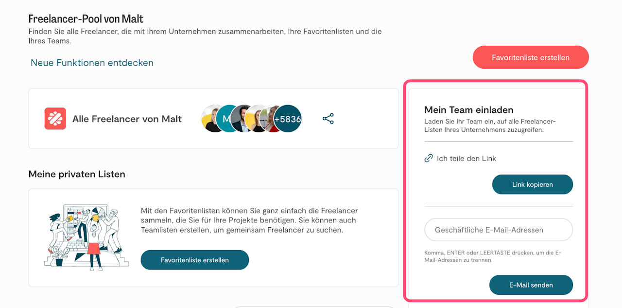 Mit Malt können Sie Freelancer anzeigen, die bereits für Ihr Unternehmen gearbeitet haben oder die von Ihren Kollegen empfohlen wurden. Als Benutzer eines Unternehmenskontos können Sie nun alle Freelancer in Ihrem Unternehmen sehen: diejenigen, die mit Ihren Kollegen zusammenarbeiten (über Malt oder nicht), sowie Freelancer, die sie zu ihren Favoriten hinzugefügt haben.
