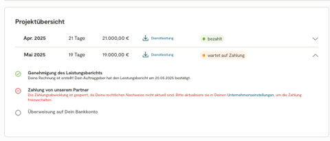 Sie erhalten Ihre Zahlung innerhalb von 10 Arbeitstagen ab dem Datum der Validierung Ihres Auftrags oder des letzten von Ihrem Kunden validierten Tätigkeitsberichts und haben gleichzeitig die Möglichkeit, dem Kunden unter bestimmten Voraussetzungen auch später zu zahlen.