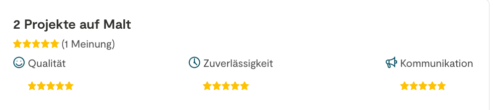Der Ruf von Freiberuflern ist wichtig, und mit Malt können sie ihr Fachwissen präsentieren und ihren Ruf online aufbauen. Dank der Kunden die ihnen zuvor ihr Vertrauen geschenkt und eine Bewertung hinterlassen haben, können sie ihr Geschäft ausbauen und von ihrem Ruf profitieren.