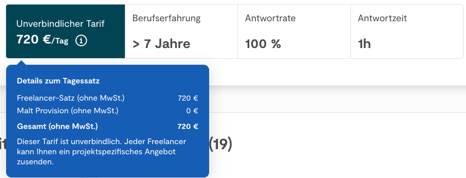 Nein, wir berechnen keine Provision für Freelancer. Du erhältst den Tagessatz vom Kunden, den du auf Deiner Profilseite angibst.