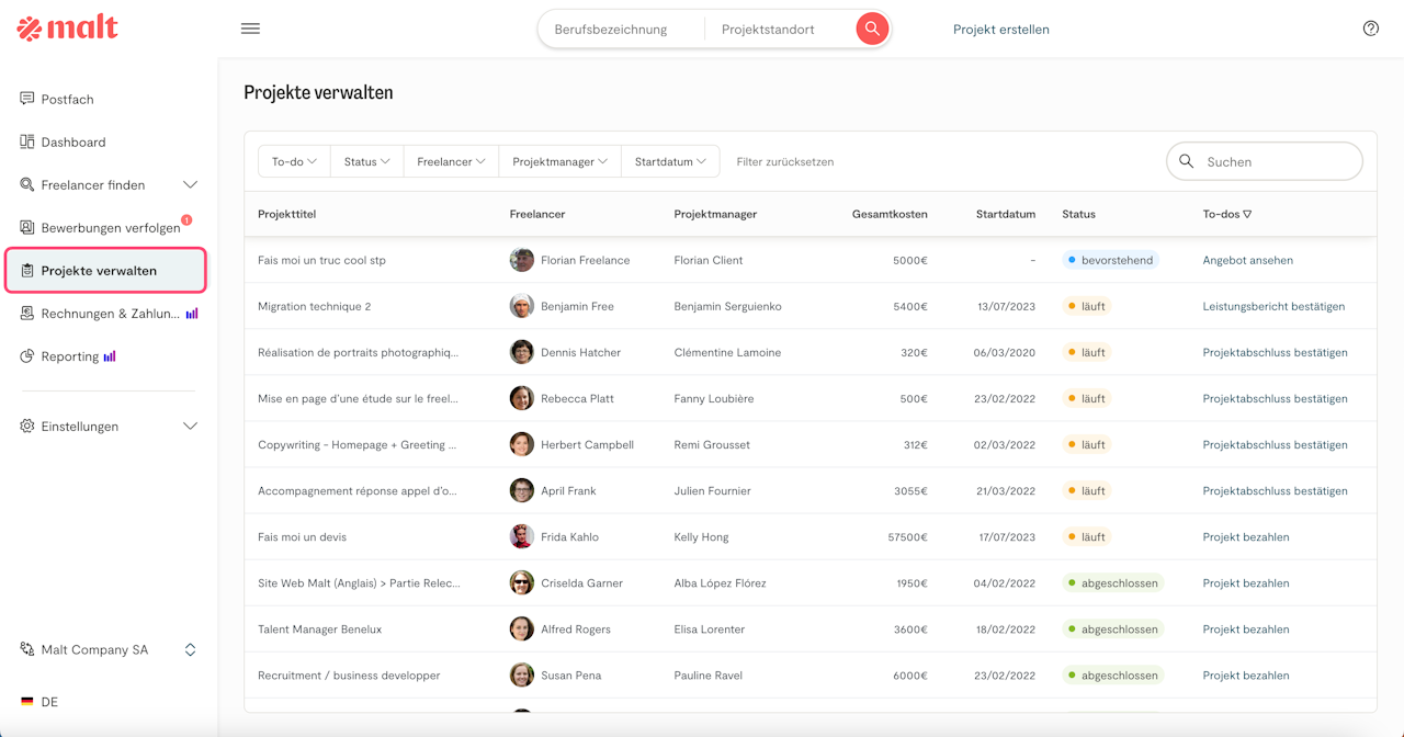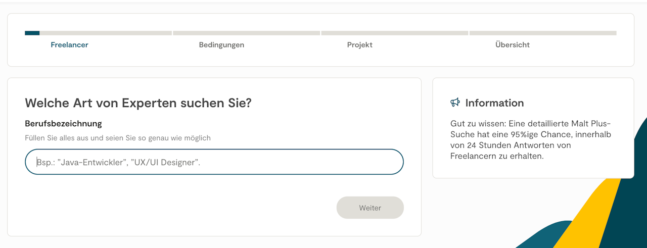 Mit Malt Plus profitierst Du von einem fortschrittlichen Beschaffungssystem und erhältst so in weniger als 24 Stunden Bewerbungen von verfügbaren und qualifizierten Freiberuflern, die Deinen Anforderungen entsprechen.