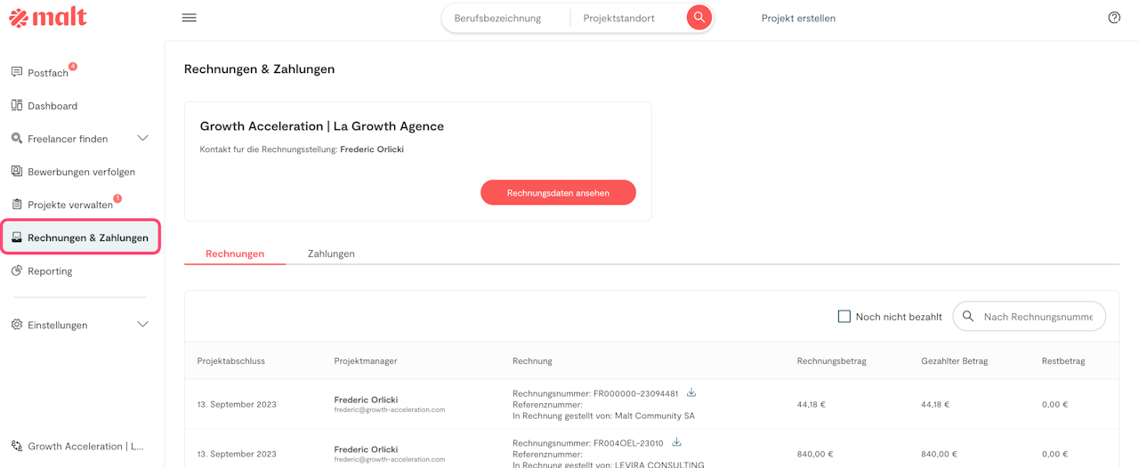 Diese Registerkarte ist nur für Unternehmensadministratoren sichtbar. Du kannst Deine Rechnungen zentralisieren und herunterladen.