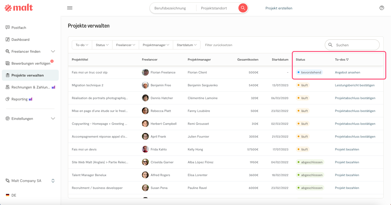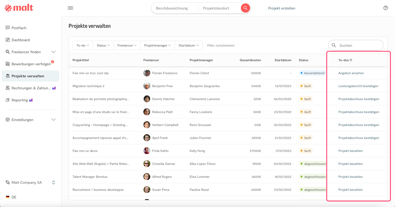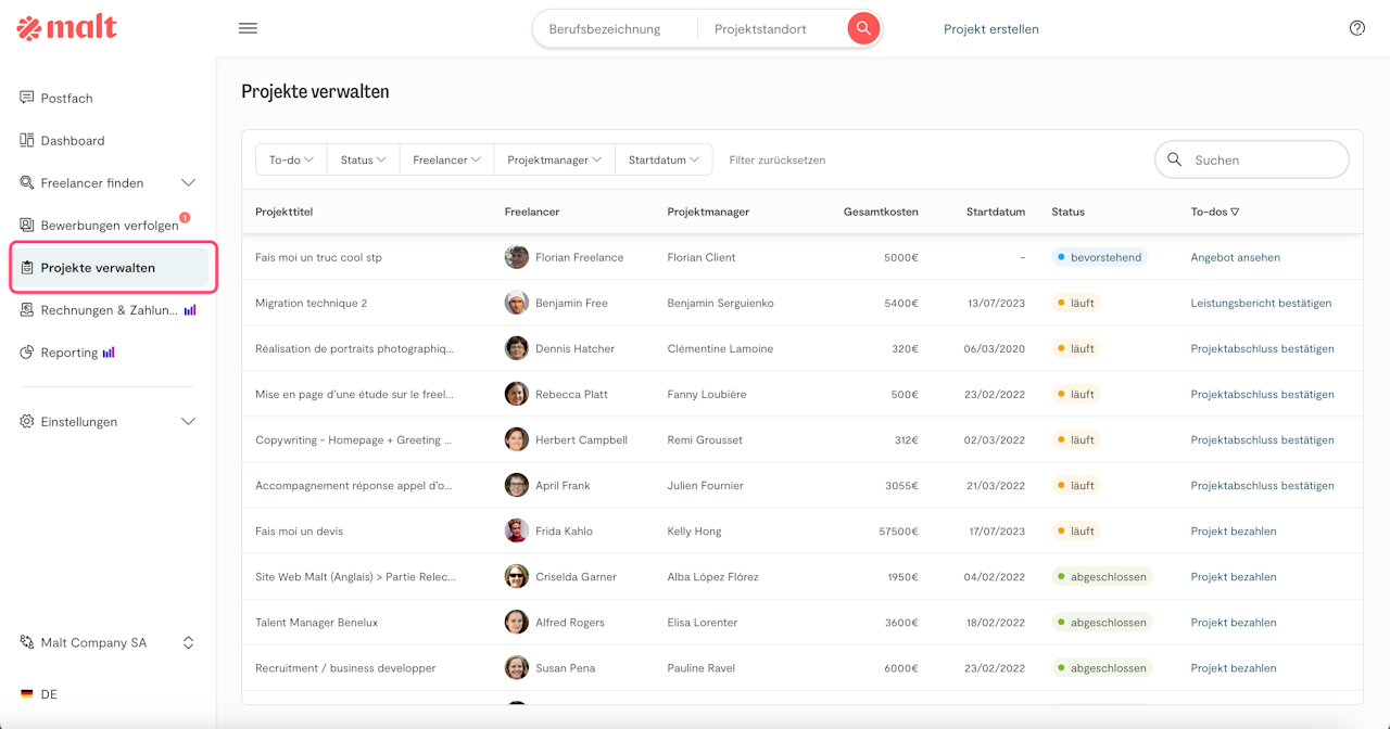 Wenn Du Fragen zu wiederkehrenden Projekten hast, laden wir Dich ein, Deine Vertriebskontakt über Dein Dashboard direkt oder alternativ den support@malt.de zu kontaktieren.