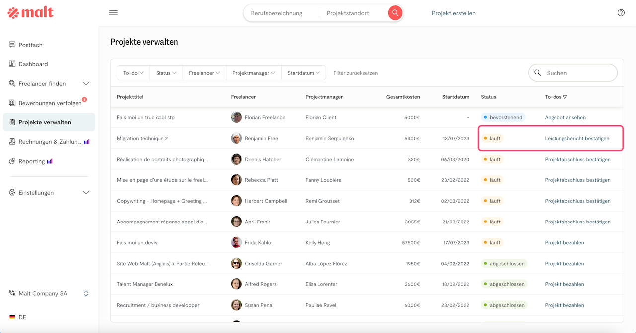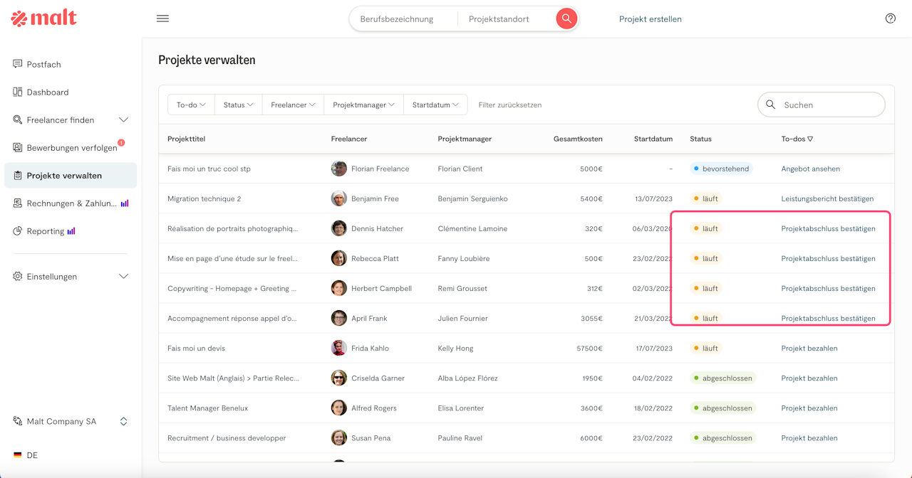 Sie haben 15 Tage Zeit, um das Ende des Projekts zu bestätigen. Nach Ablauf dieser Frist und ohne Kontakt Ihrerseits wird das Projektende automatisch bestätigt.