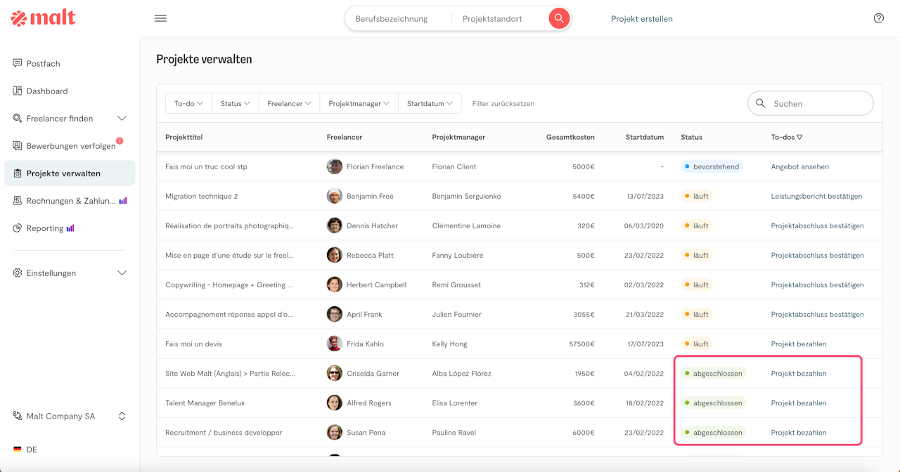 Wenn Du bereits Geld auf Dein Malt-Konto eingezahlt hast, werden die Mittel dann an den Freiberufler überwiesen (es sei denn, der Service wurde verlängert; in diesem Fall musst Du den Restbetrag des Projekts bezahlen).
