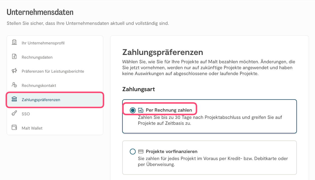 Ihre Zahlungsbedingungen hängen von Ihrer Vereinbarung mit Malt ab und Sie finden diese Details auf Ihren Rechnungen.