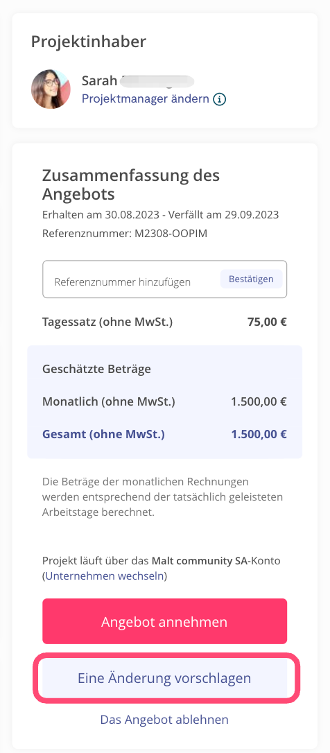 Wenn Du einen Vertrag mit einem auf Malt kontaktierten Freiberufler abschließen möchtest, muss das Angebot über unsere Plattform erstellt und validiert werden.