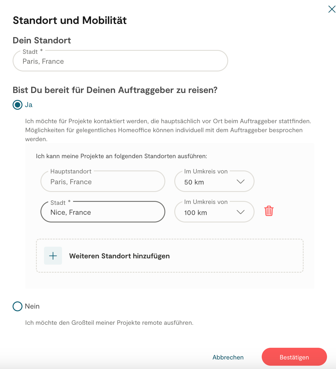 Reisen: Du bist flexibel und bereit, Projekte mit dem Kunden zu übernehmen, oder arbeitest Du ausschließlich remote? Du kannst auch angeben, dass Du nur einen Teil des Projektes mit dem Kunden durchführst. Die 0-Bewegung ist die einzige Präferenz, die nicht gelöscht werden kann, sie muss ausgefüllt werden.