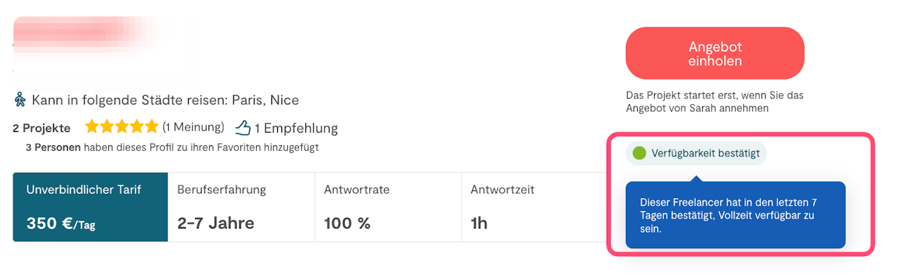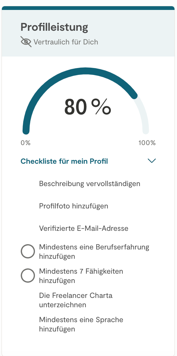 Auch wenn Dein Profil unsichtbar ist, kannst Du kontaktiert werden und neue Projektanfrage erhalten, allerdings in reduzierter Anzahl. Um Deine Chancen zu maximieren, schnell ein Projektanfrage zu erhalten, empfehlen wir Dir, Dein Profil sichtbar zu halten.