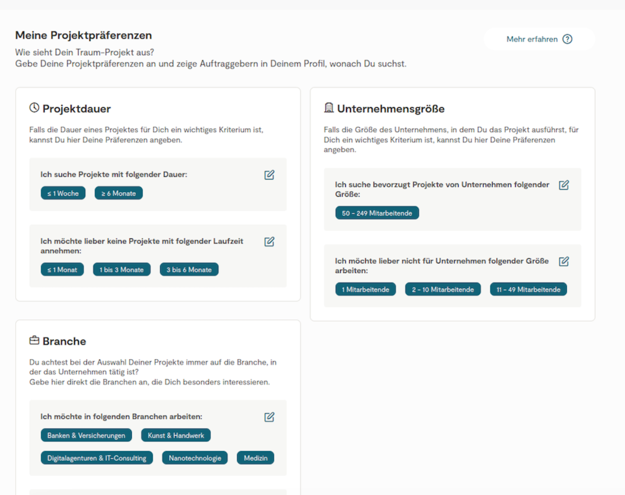 Mithilfe der Projekteinstellungen kannst Du die Projekte, die Dich interessieren, laut und deutlich ankündigen. Wir kümmern uns darum, sie für Kunden sichtbar zu machen, damit Du Projektanfragen erhälst, die Deinen Kriterien am besten entsprechen: