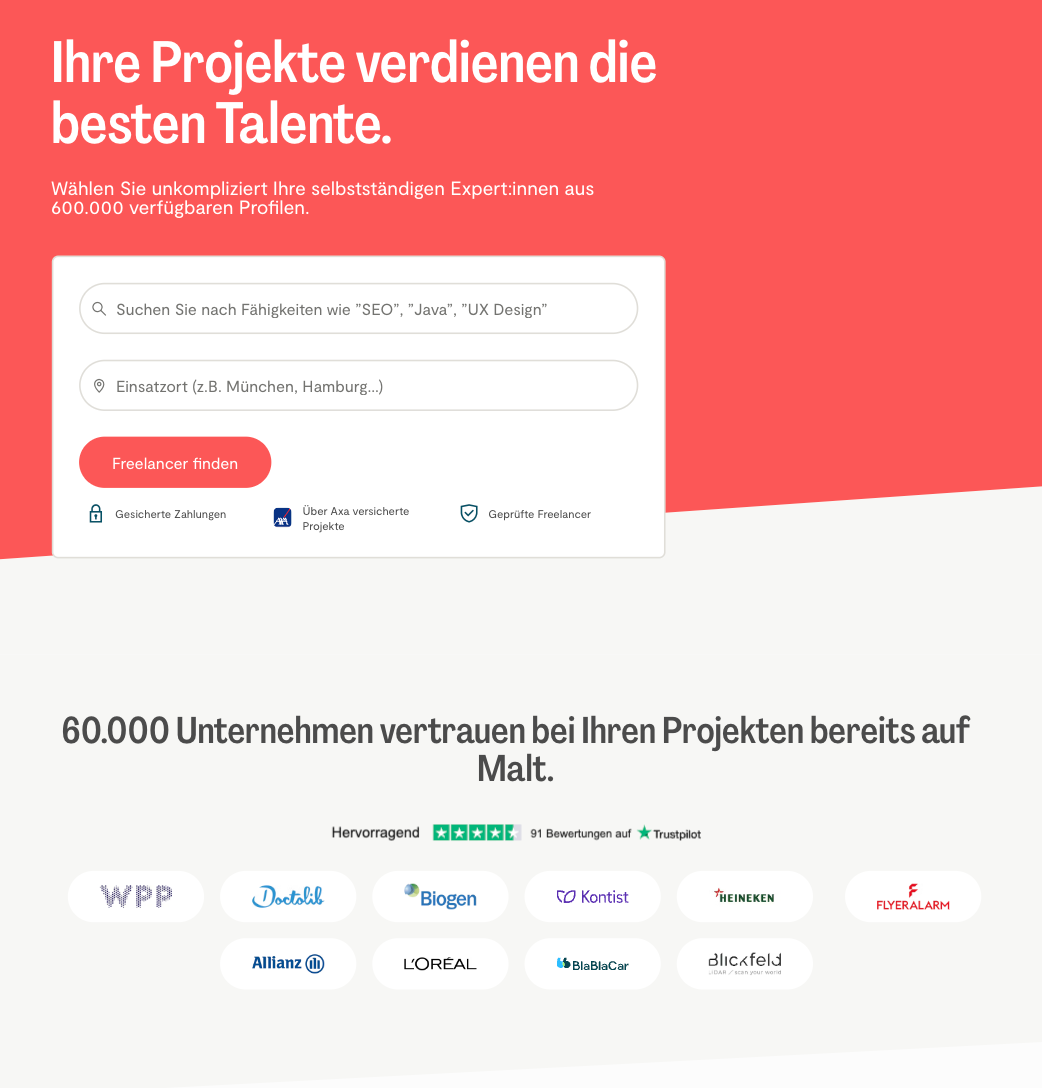 Eine Registrierung bei Malt ist erforderlich, um Freiberufler zu kontaktieren und Deine Beziehung zu Dir zu verwalten. Dank Deines Kundenprofils hast Du Zugang zu unserer Community von über 500.000 Freelancern.