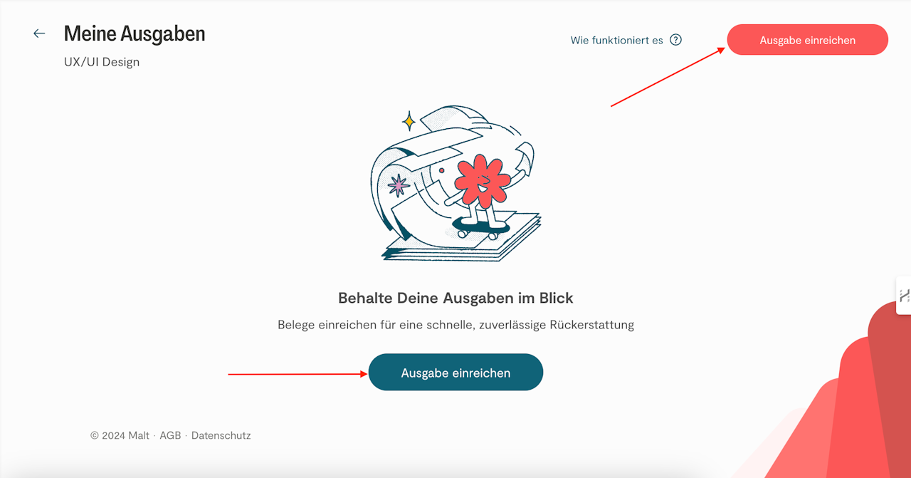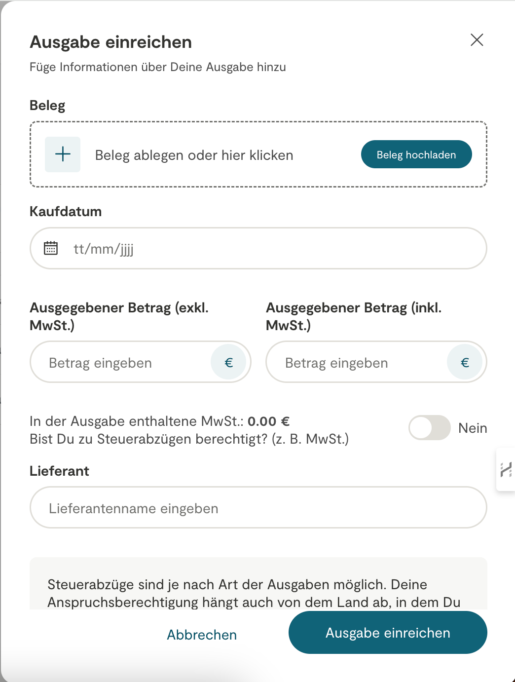 💡Da wir wissen, dass das Einreichen von Ausgaben schwierig sein kann, haben wir dieses Benutzerhandbuch erstellt , um Dir bei Bedarf zu helfen. Dieses Handbuch ist jederzeit auf Deiner Plattform auf der Ausgabenseite verfügbar.