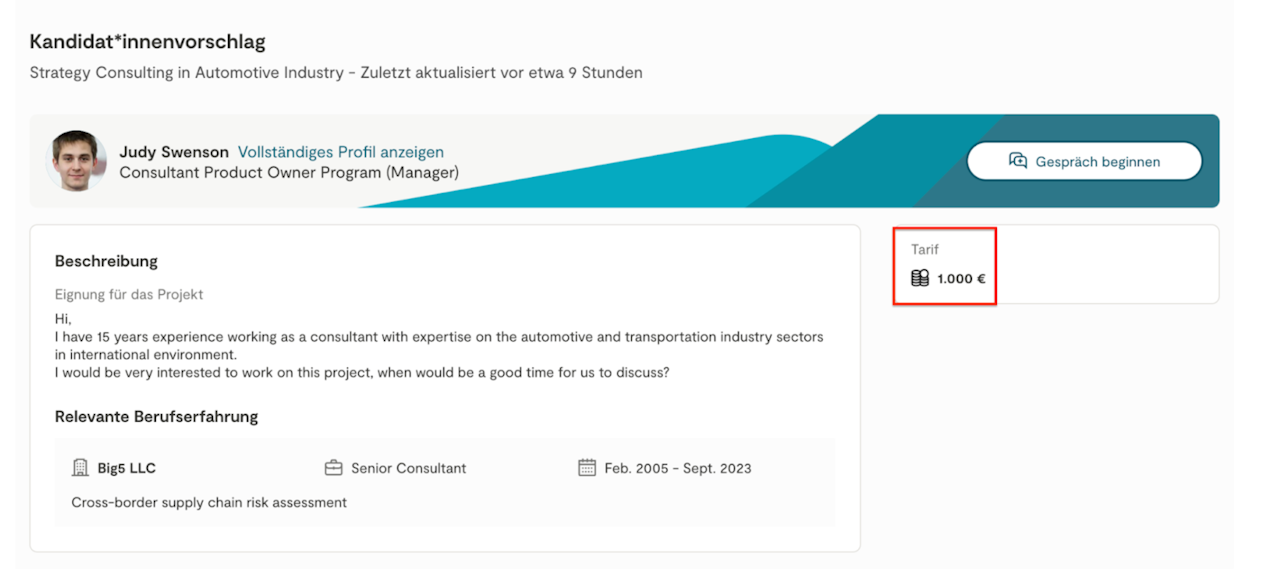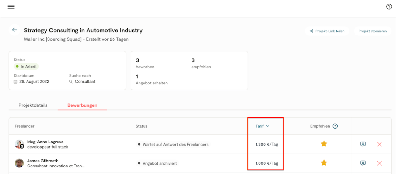 Die vom Berater*innen bereitgestellten Informationen sind auf Dein Projekt zugeschnitten und berücksichtigen dabei die Details und Anforderungen, die Du in Deinem Angebot geäußert hast, um Dir die nützlichsten Informationen für Deine Wahl zu geben.