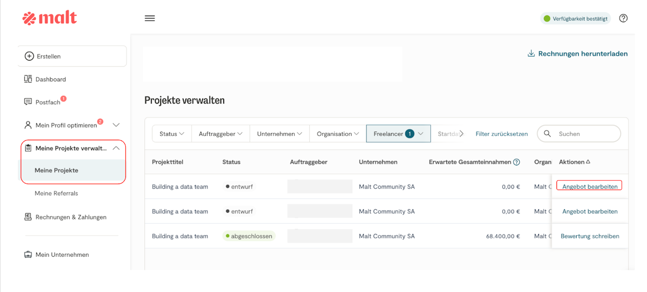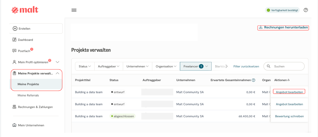 Du kannst Deine Entwürfe, Deine Angebote bis zur Annahme, Deine laufenden und abgeschlossenen Projekte sowie abgebrochene Projekte/Budgets einsehen.
