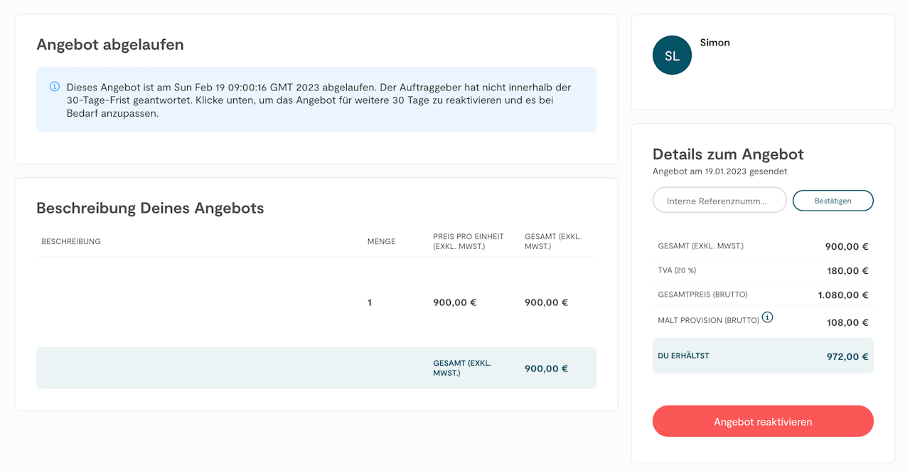 Um dein Angebot zu reaktivieren, musst du es aufrufen und auf den Button "Angebot reaktivieren" klicken. Dies ermöglicht es dir, das Angebot zu reaktivieren und es für weitere 30 Tage gültig zu machen.