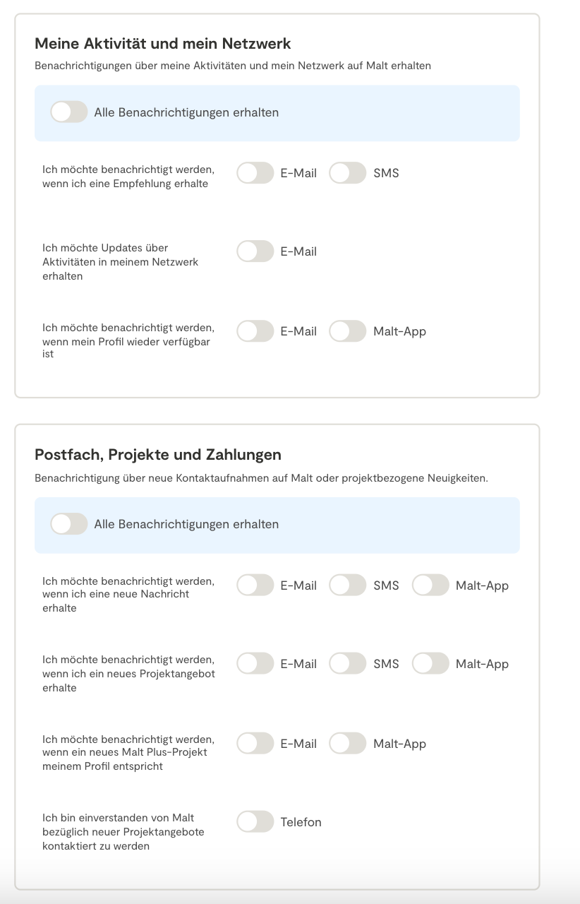 Mit Malt kannst Du Benachrichtigungen anzeigen, wenn Du eine Nachricht auf der Plattform erhältst. Wenn Du Deine Einstellungen für den Nachrichtenversand ändern möchtest kannst Du dies direkt tun, indem Du auf den folgenden Link klickst: https://www.malt.de/account/notifications