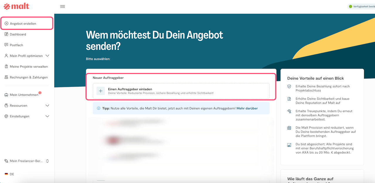 Wenn Du Deinen Kunden einladest, das Projekt über Malt auszuführen, hast Du die folgenden Vorteile: