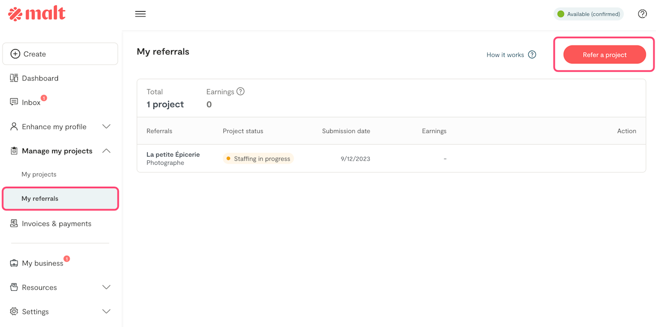 You can track the progress of every eligible opportunity you submit on the platform in your Malt space. Simply go to the "Dashboard" section and you will be able to follow up on payments as well. You can track this opportunity as soon as Malt validates the eligibility of the project. We will also proactively keep you informed.