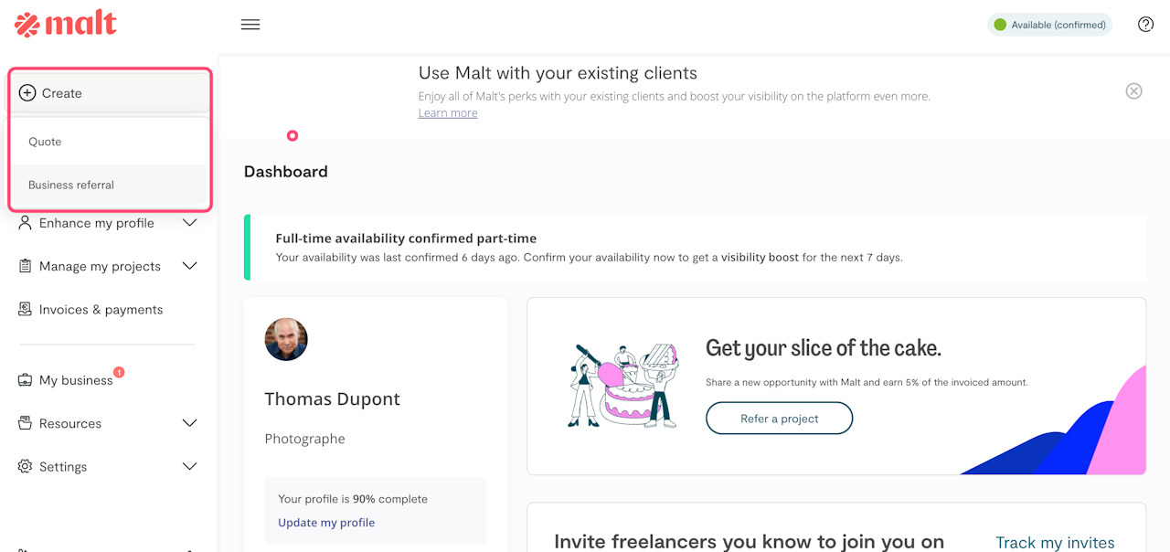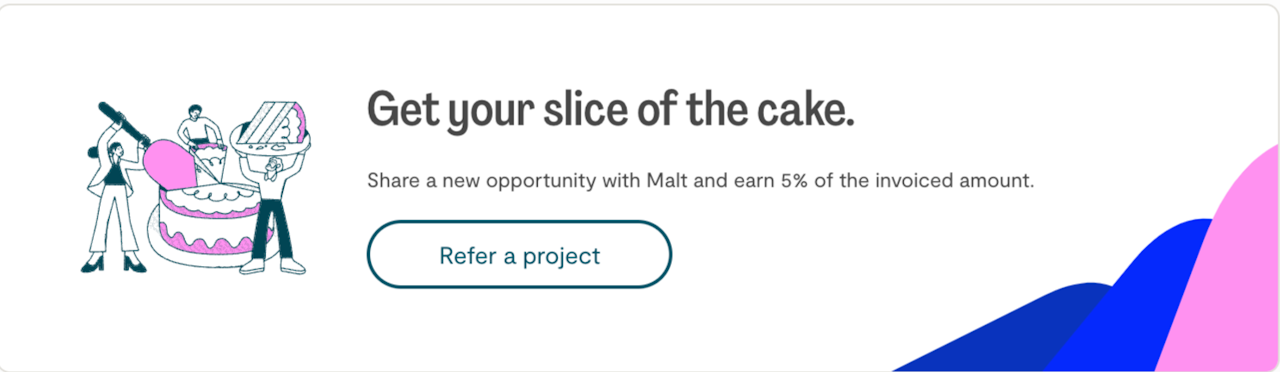 The business referral program offers freelancers and consultants a simple way to earn a passive income and make clients happy by referring project opportunities at Malt. If the client works with a Malt freelancer for the project they have referred, they’ll earn 5% of the invoiced project value (TV).
