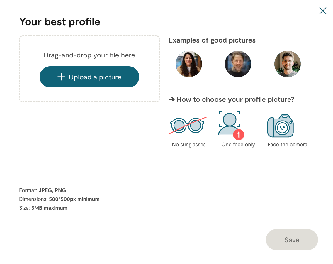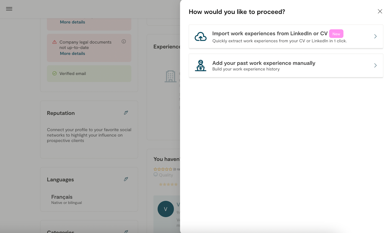 To do this, click on “Add an experience”, select the option “Import work experience from LinkedIn or CV” and upload your file, and we'll take care of the rest.