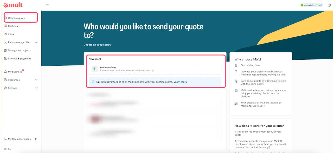 Do you work with a client outside of Malt? Whether your client is already a Malt user or not, invite him and both benefit from all of our services for your assignments.